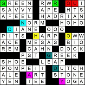 In top-to-bottom grid order, those spell contest answer GROUNDHOG DAY, the 1993 Bill Murray/Andie MacDowell rom-com. On a scale from 1 to 10, how annoying do you find it when someone refers to this movie as “Groundhog’s Day”? It’s about a 7 for me.