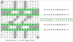 Which movie do these four quotes point to? 2007’s “Ocean’s Thirteen,” found by 367 solvers, of which 333 were solo solves. Each theme entry is an anagram of OCEAN’S THIRTEEN; quite remarkable that Jeffrey found so many smooth-sounding anagrams, especially using such specific words as HEIST, CASINO, and THEATERS. Bravo!